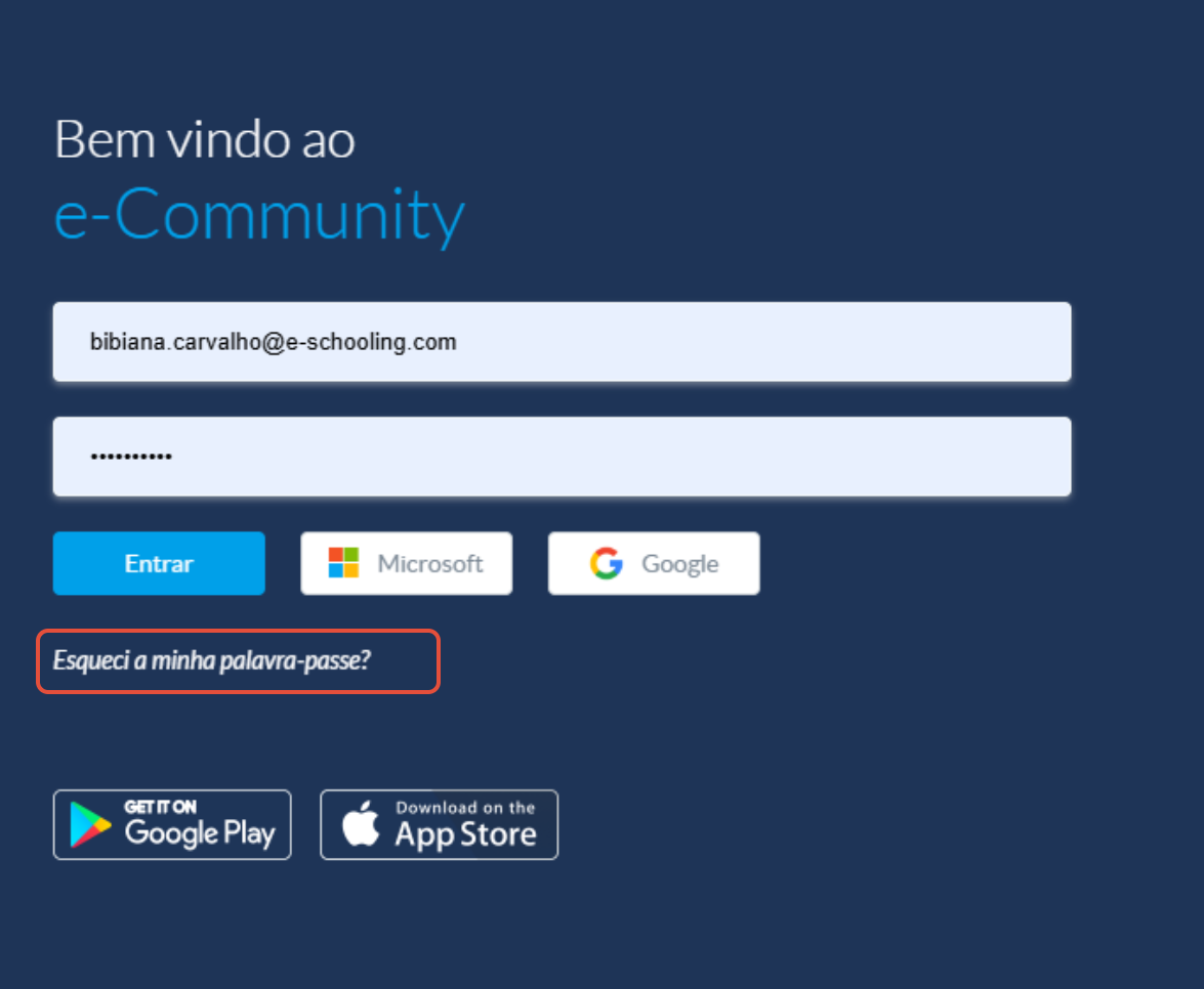 Nota: Se não se recordar do seu e-mail que está associado à sua conta de acesso ao eCommunity, contate a escola para que a instituição lhe gere novos dados de acesso à plataforma.