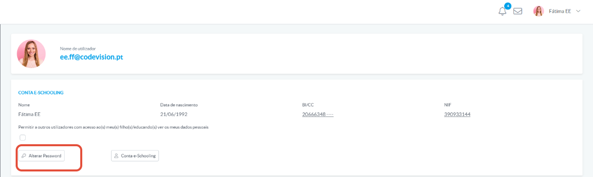 - Aceder aos seus dados (clicando na foto no canto superior direito e no botão ver perfil) e clicar no botão de "Alterar Password"