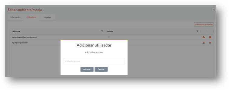 O utilizador a adicionar deve já ter conta criada no e-Schooling.