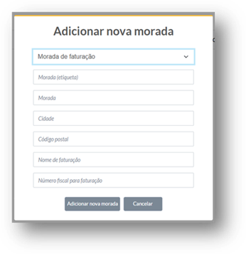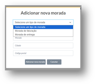 Ao clicar no botão “Adicionar morada”, será aberta uma nova janela onde deverá indicar, no primeiro campo, o tipo de morada: