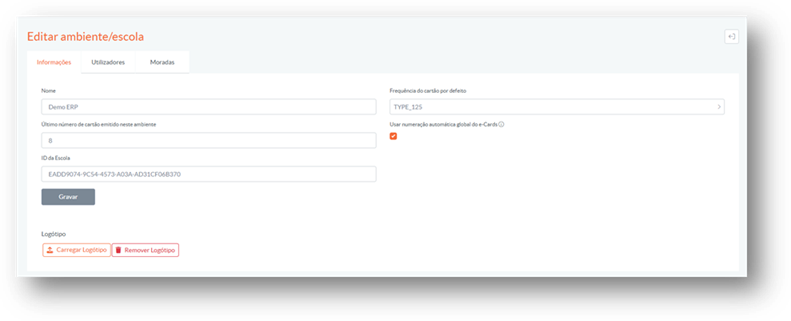 Em cada ambiente fica centralizada toda a informação necessária para a emissão de cartões dessa entidade/escola, nomeadamente: